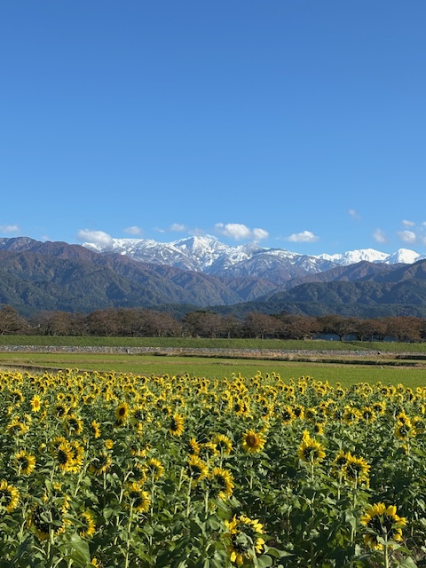 秋はひまわり、紅葉、立山の緑と雪の白の四重奏