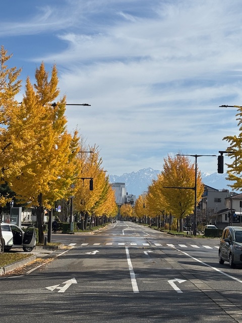 護国神社前の銀杏並木、奥には立山